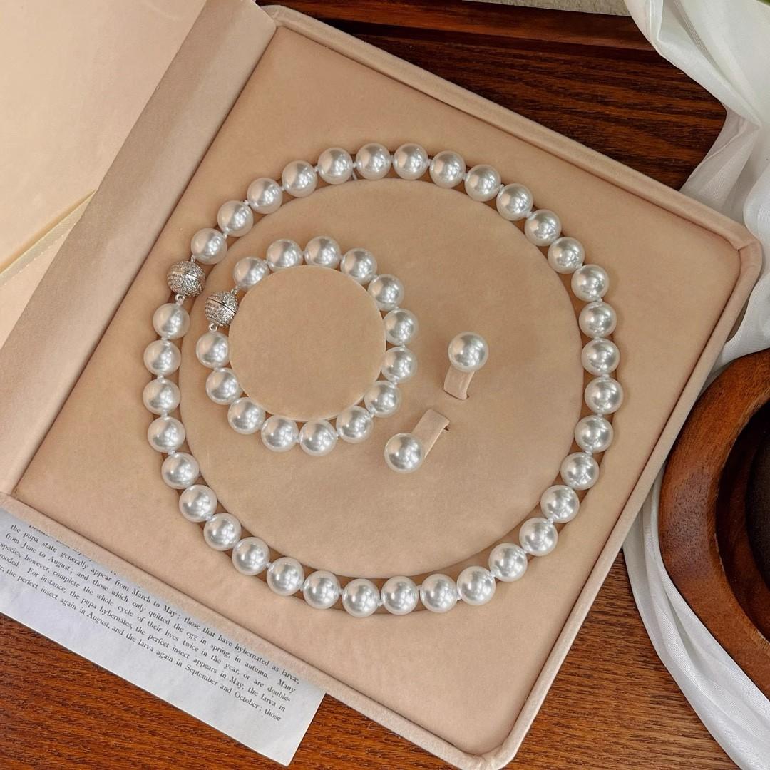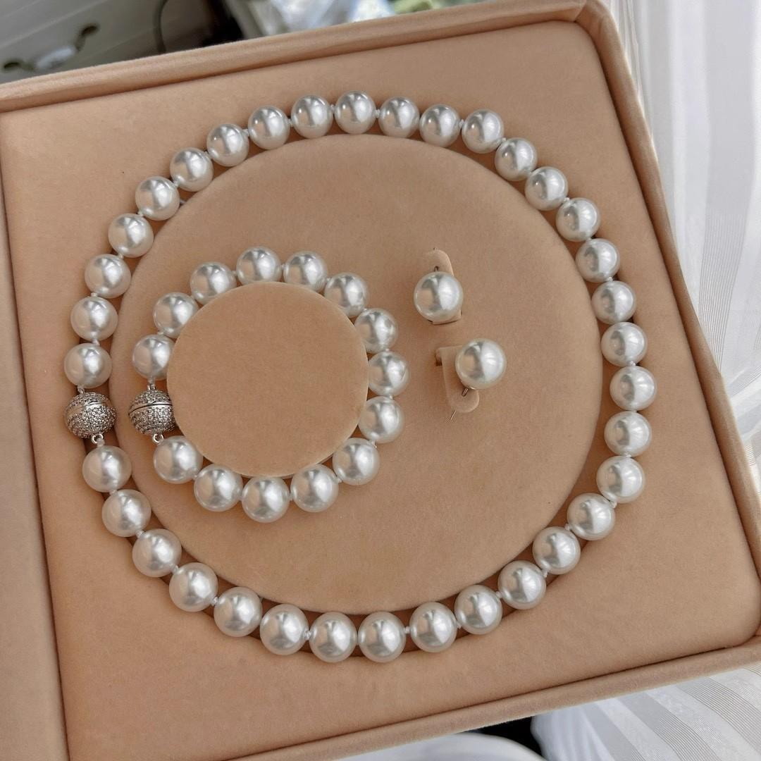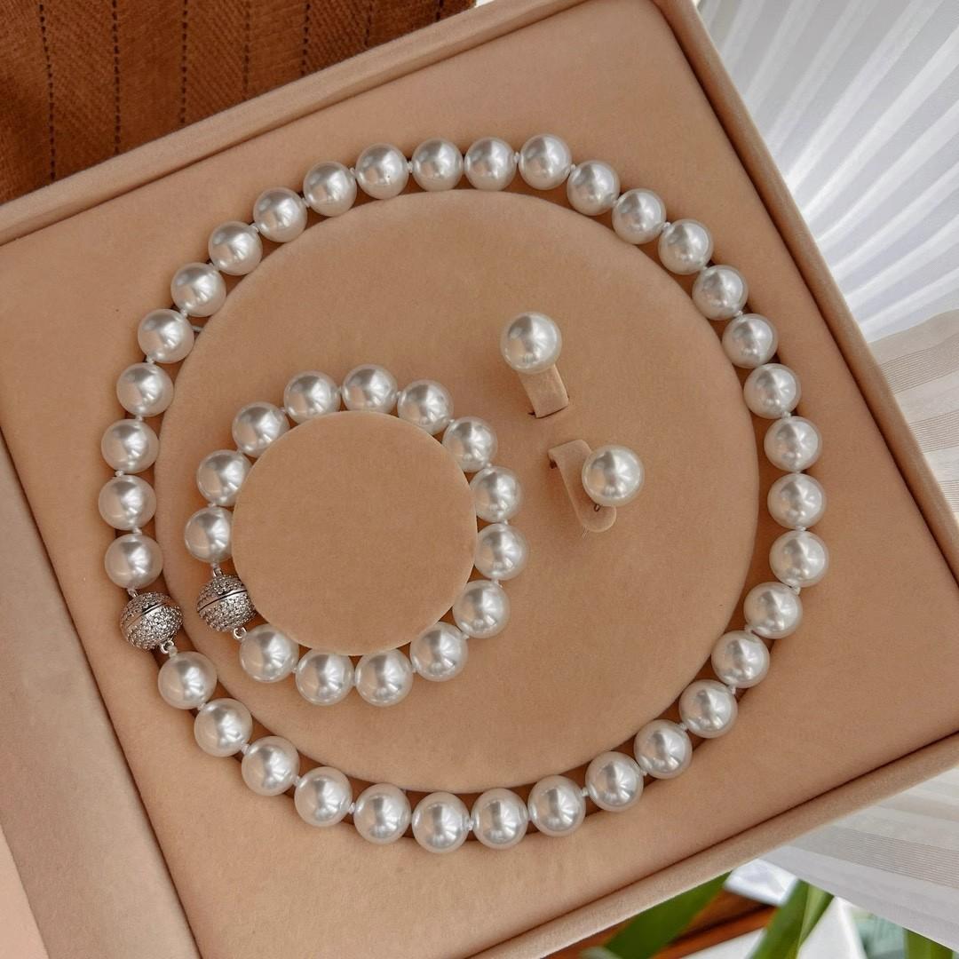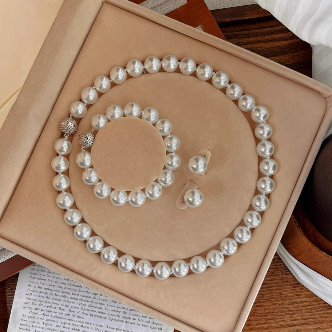 12Mm cold white, pearl decorative necklace + bracelet + stud earrings, Jewelry set, magnetic button, suitable for parties, graduations, birthday gifts, Mother's Day gifts, length 45cm