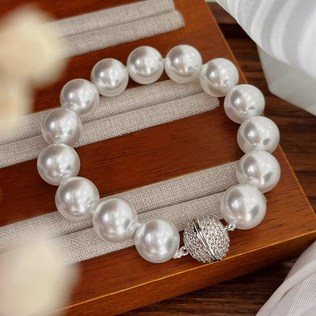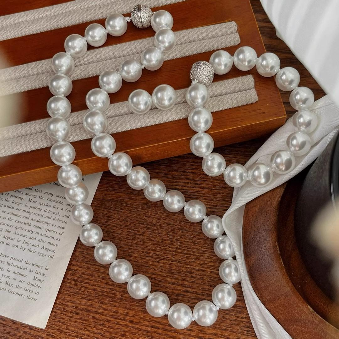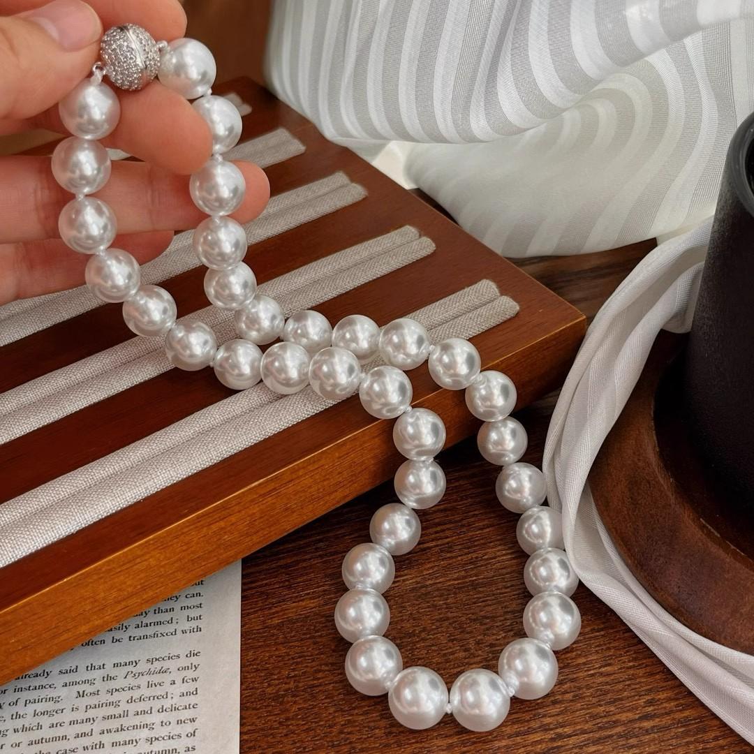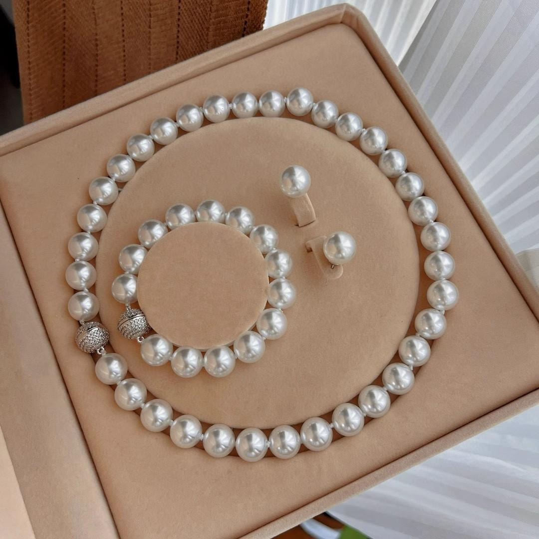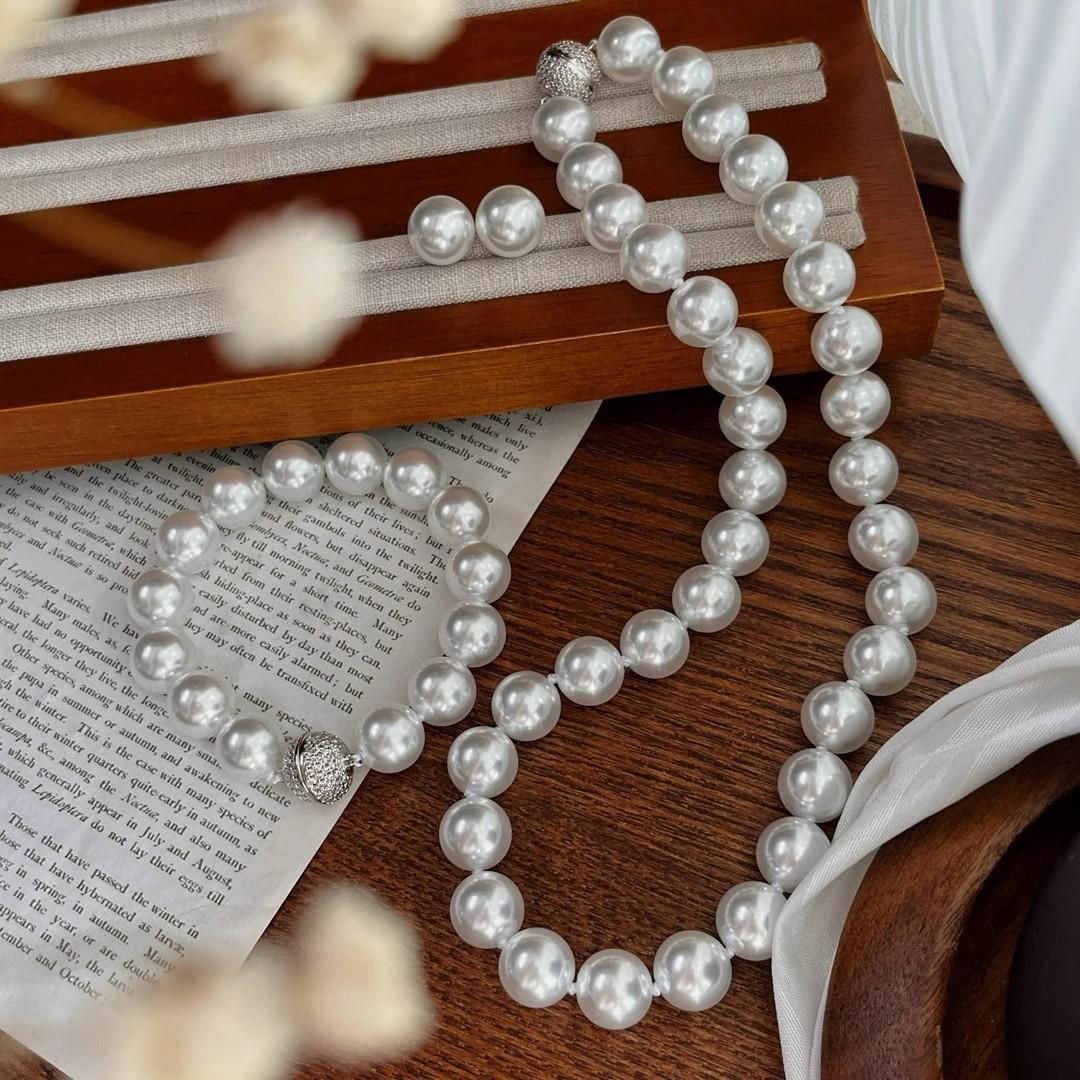 12Mm cold white, pearl decorative necklace + bracelet + stud earrings, Jewelry set, magnetic button, suitable for parties, graduations, birthday gifts, Mother's Day gifts, length 45cm