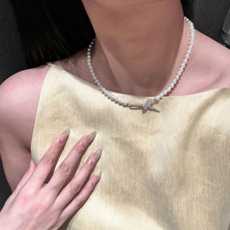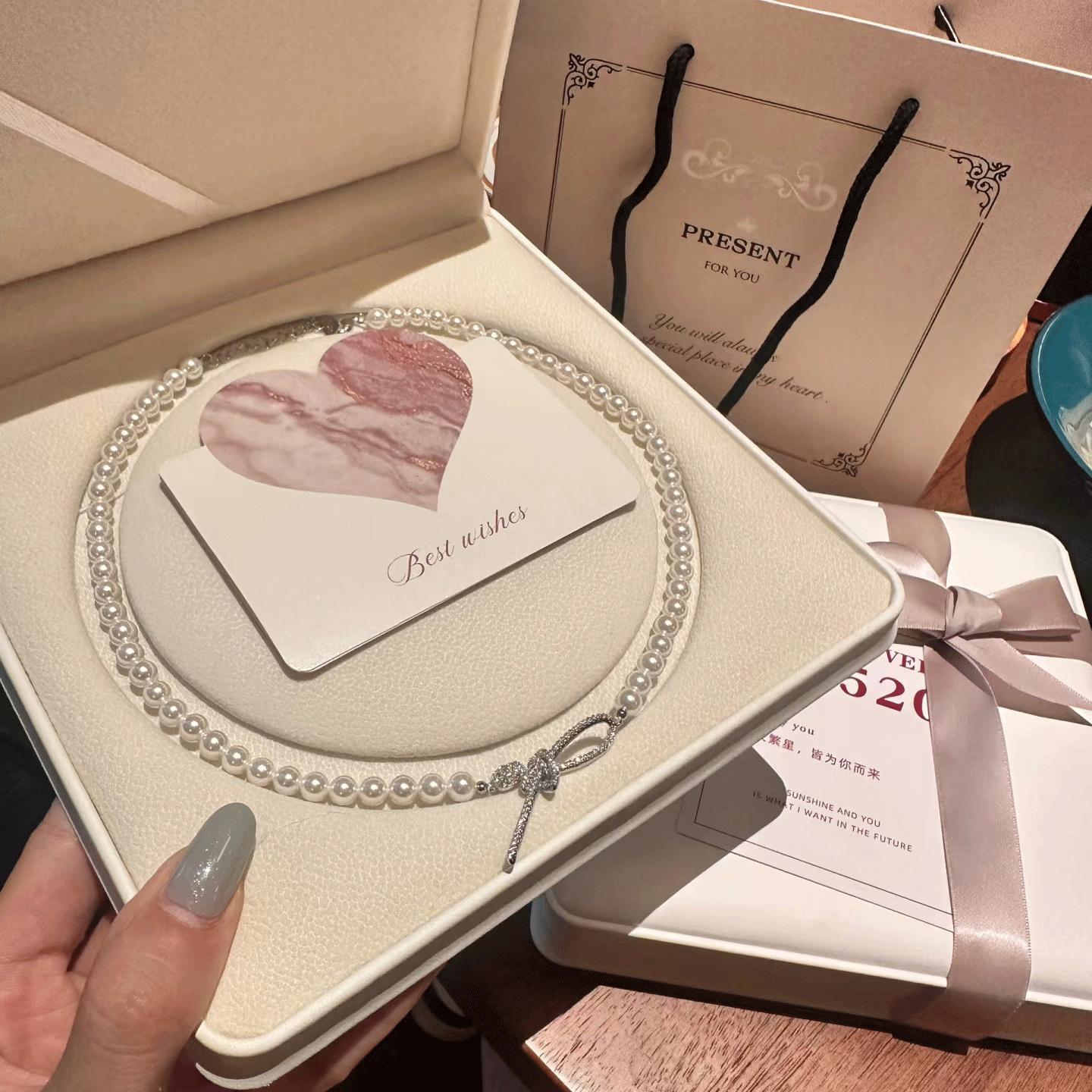 White & Gray Baby Pearl Necklace with Bow – 4mm 6mm 8mm Pearl Chain, Elegant Gift for Girls, Girlfriend & Wedding