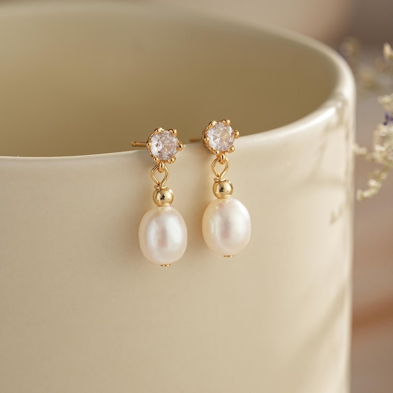 Diamond Pearl Stud Earrings,Dainty Freshwater Pearl Earrings,Gold Minimalist Drop Earrings,Bridal Earrings,Wedding Earrings,Bridesmaid Gift