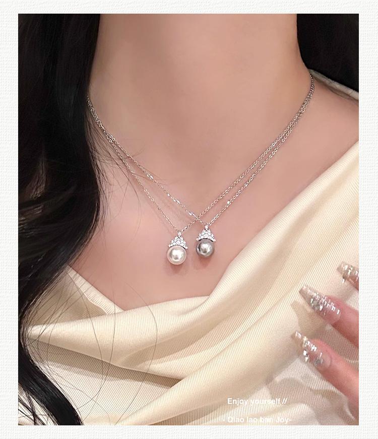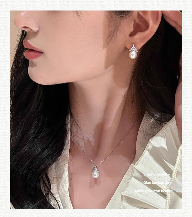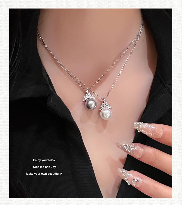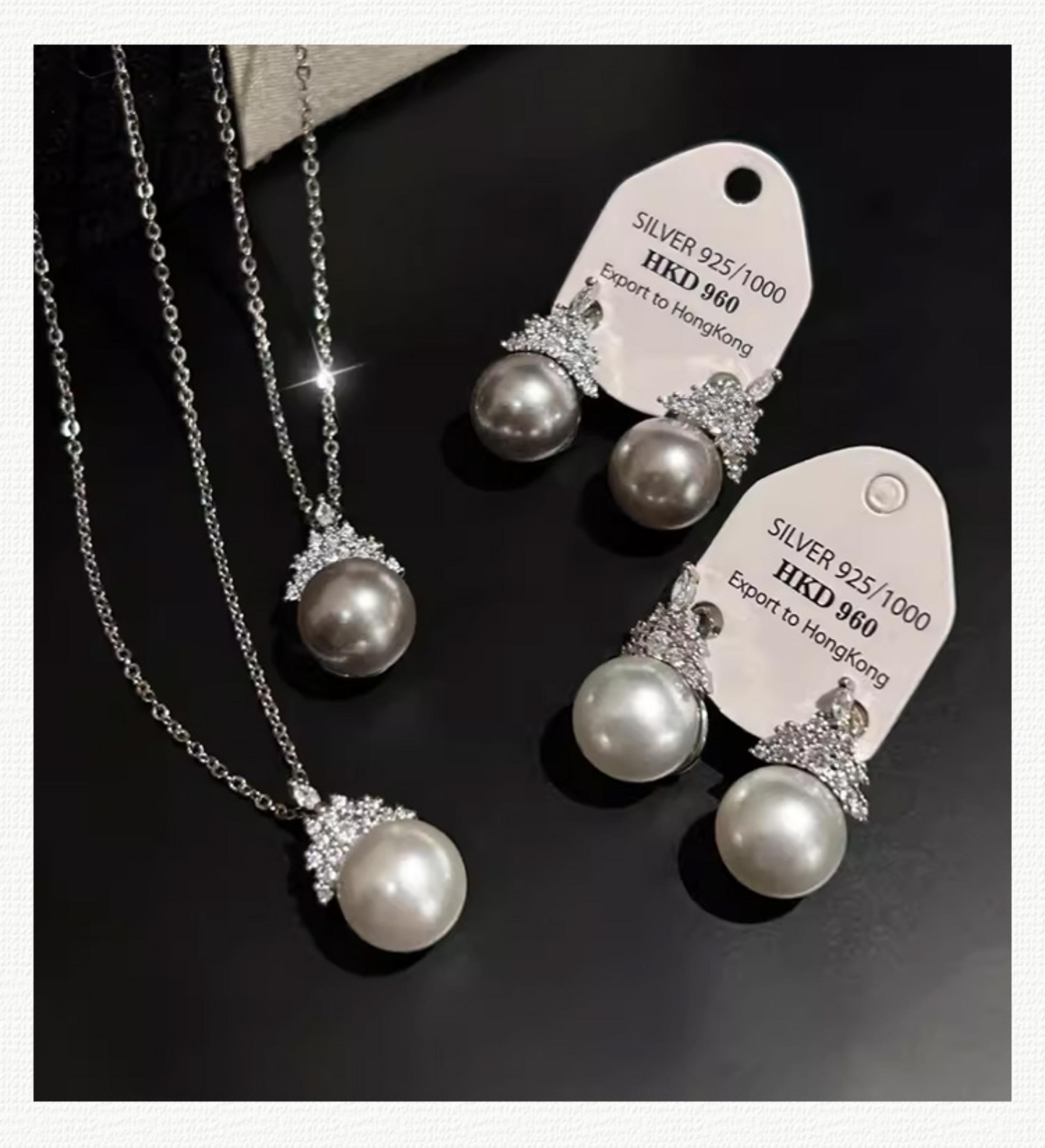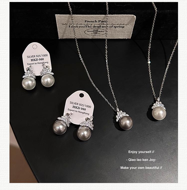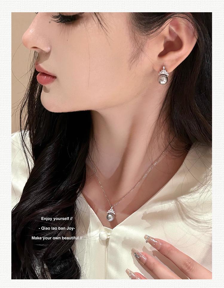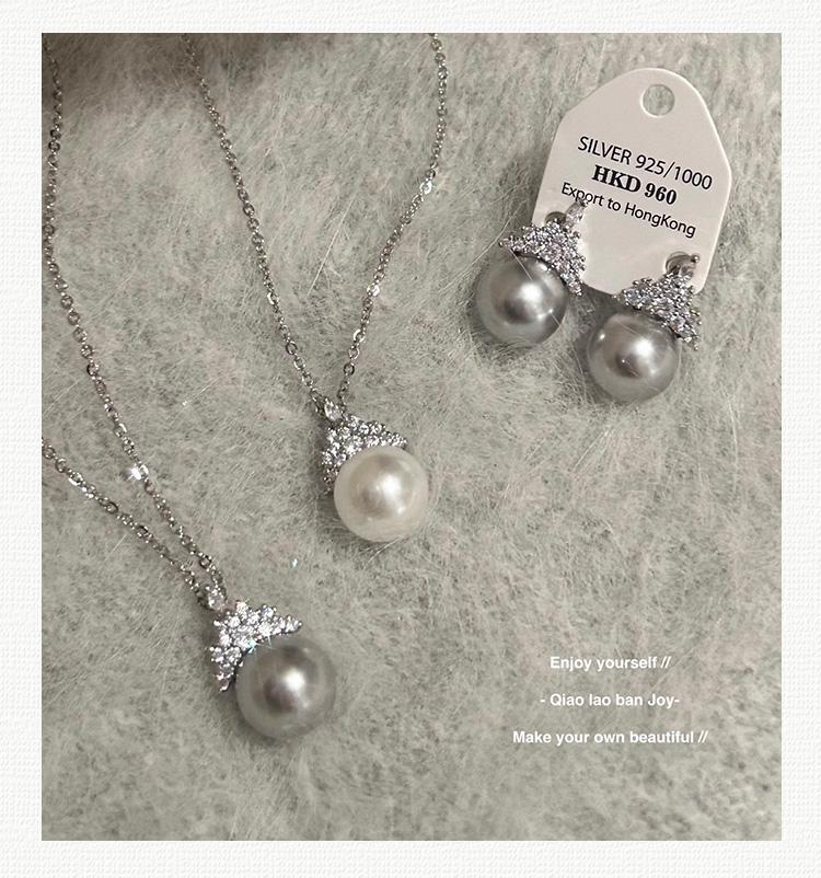 Flash diamond gray pearl necklace earrings set 925 silver needle set light luxury texture temperament simple, girlfriend gift, party