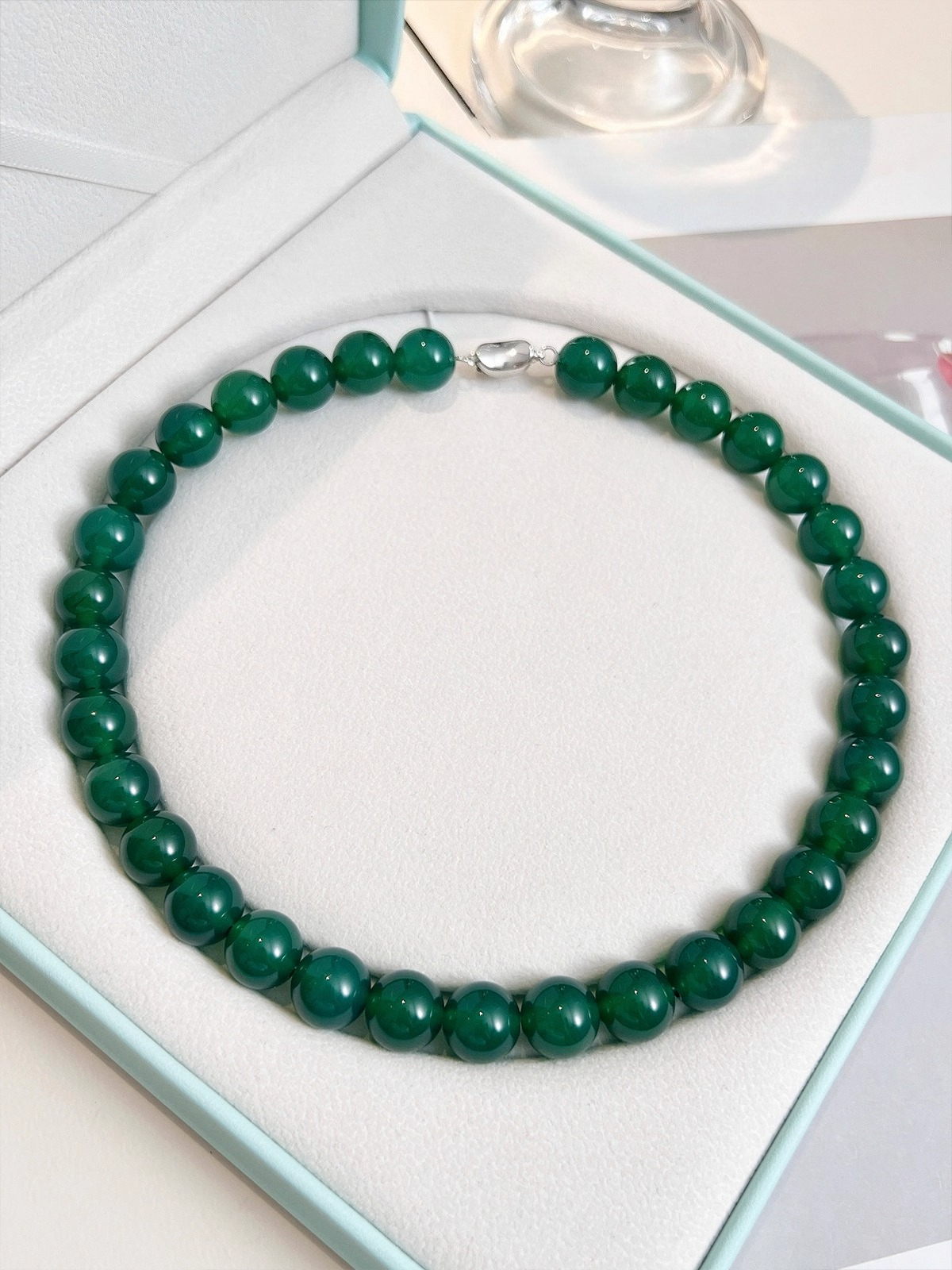 Green Chalcedony Bead Necklace – Natural Green Gemstone Necklace with 925 Sterling Silver Clasp, Elegant Women’s Jewelry