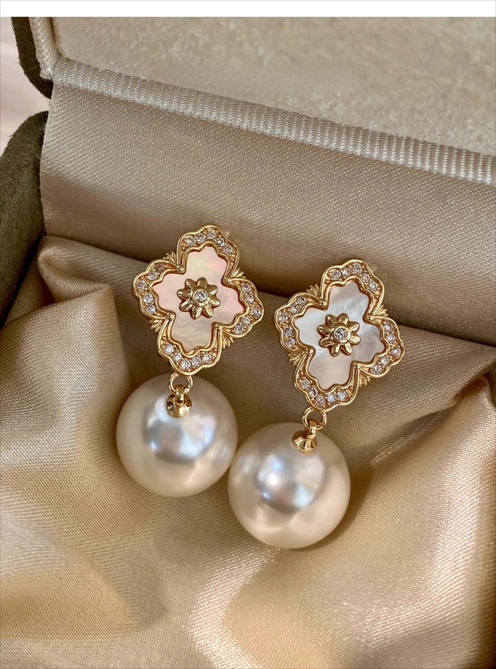 14mm Pearl Drop Earrings – Gold Mother-of-Pearl Clover Dangle Earrings, Luxury Statement Jewelry for Women